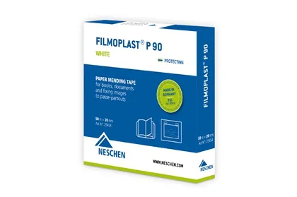 Das weiße Spezialpapier filmoplast® P 90 ist ein einseitig selbstklebend ausgestattet. Es eignet sich zum Einkleben ausgerissener Seiten und Reparieren von kaputten Kanten. Das eingesetzte Spezialpapier hat eine ideale Abstimmung von Stabilität und Festigkeit. filmoplast® P 90 verlängert die Lebensdauer von Büchern und Dokumenten. Es dient zur Verstärkung der Buchgelenke von Taschenbüchern und der Reparatur alter Buchlagen. Auch für die Montage von Fotos oder Papieren hinter dem Passepartout mit einer T-Hinge-Befestigung wird filmoplast® P 90 eingesetzt. Das Produkt eignet sich zudem für das staubdichte Abkleben der Rahmenrückseite um ein Eindringen von Staubpartikeln und Insekten zu verhindern. Der lösemittelfreie, dauerelastische Klebstoff bietet eine leicht zu verarbeitende Alternative zu wasseraktivierbaren Klebebändern. Der Kleber von filmoplast® P 90 ist schwach alkalisch eingestellt, sodass keine Schädigung des Papiers möglich, aber gleichzeitig genügend Pufferkapazität vorhanden ist, um Säurefraß zu verhindern.