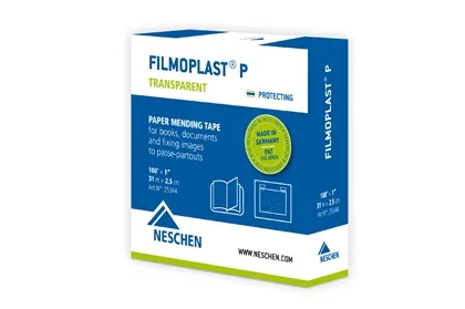 Das selbstklebende, hauchdünne Papier-Reparaturband filmoplast® P ermöglicht ein fast unsichtbares Reparieren, zum Beispiel von eingerissenen Seiten, Notenblättern oder Zeichnungen. Beim Einscannen oder Kopieren bleibt filmoplast® P unsichtbar. Auch zum Einkleben ausgerissener Seiten und Reparieren von kaputten Kanten geeignet. Das eingesetzte Spezialpapier hat eine ideale Abstimmung von Stabilität und Festigkeit und ist gleichzeitig schmiegsam und transparent. filmoplast® P verlängert die Lebensdauer von Büchern und Dokumenten. Auch für die Montage von leichten Fotos oder Papieren hinter dem Passepartout mit einer T-Hinge-Befestigung wird filmoplast® P eingesetzt. Der lösemittelfreie, dauerelastische Klebstoff bietet eine leicht zu verarbeitende Alternative zu wasseraktivierbaren Klebebändern. Der Kleber von filmoplast® P ist schwach alkalisch eingestellt, sodass keine Schädigung des Papiers möglich, aber gleichzeitig genügend Pufferkapazität vorhanden ist, um Säurefraß zu verhindern.
