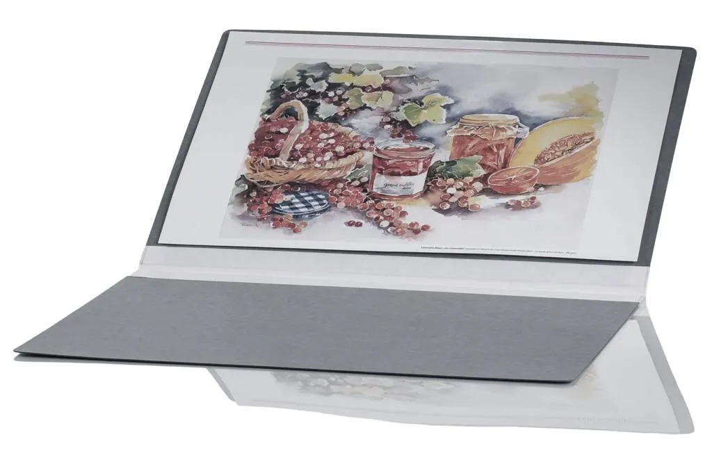Grafikmappen bestehen aus Vorder- und Rückendeckel in bester Planlage, hochstabil aus 1400 g/m² Vollpappe. Der Mappenrücken ist doppelt, innen und außen, mit säurefreiem Bibliotheksleinen verbunden. Die Füllhöhe der Mappe passt sich von 1 mm bis 25 mm variabel an. Grafikmappen liefern wir mit Verschlussbändern an der offenen Längsseite.