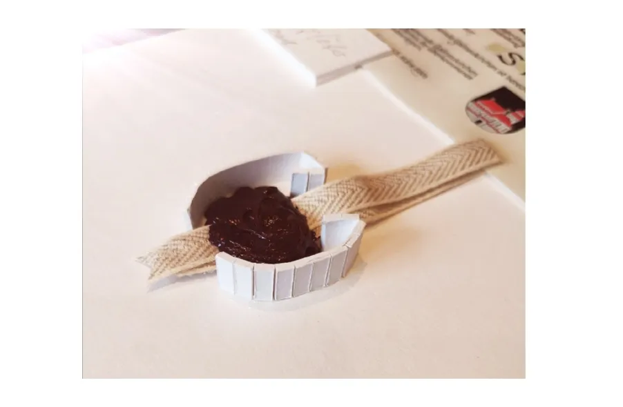 Sie können jetzt Siegel-Säulen herstellen. Etwa in der Höhe des Siegels werden aus den Flexo-Platten schmale Längsstreifen geschnitten. Diese werden auf der Innenseite verleimt und zu kleinen Säulen gerollt. Bis zur Abbindung des Archivleims (wenige Minuten) die Säulen mit einem Gummiband fixieren.